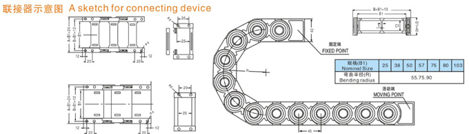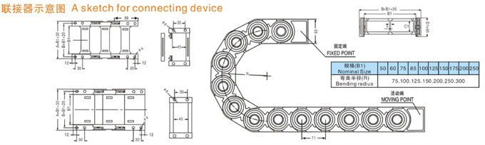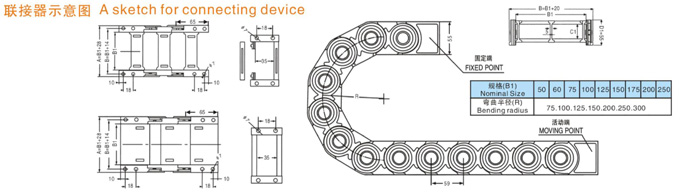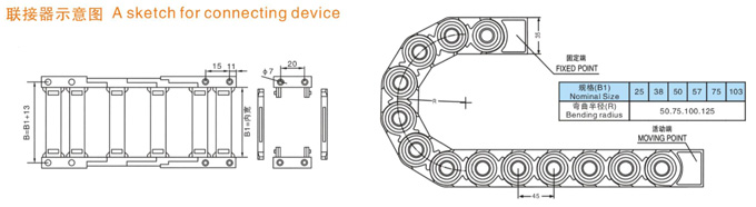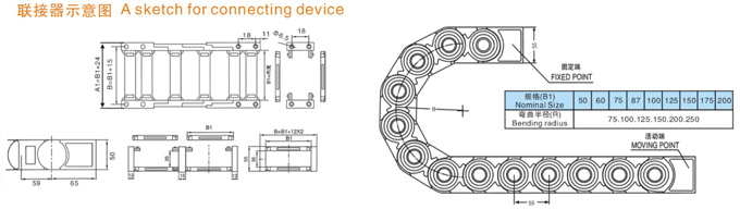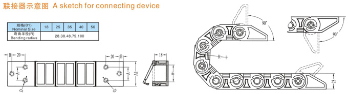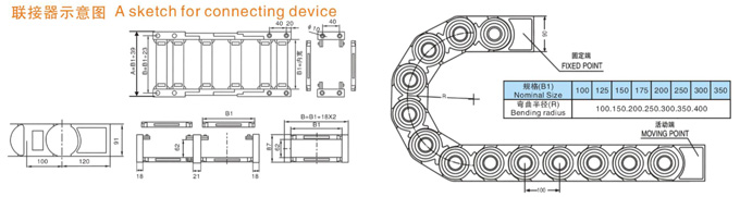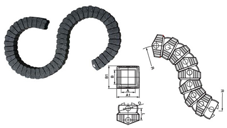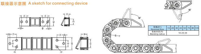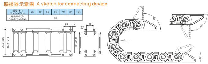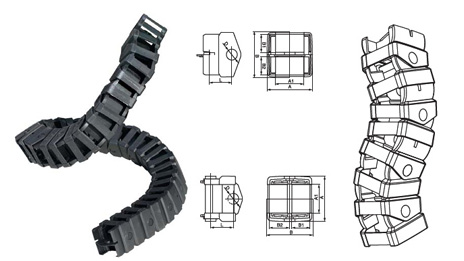 TL1型塑料拖鏈規(guī)格型號設計為組合式加強型,可任意上下開啟,安裝方便,結(jié)構(gòu)合理堅固耐用.
